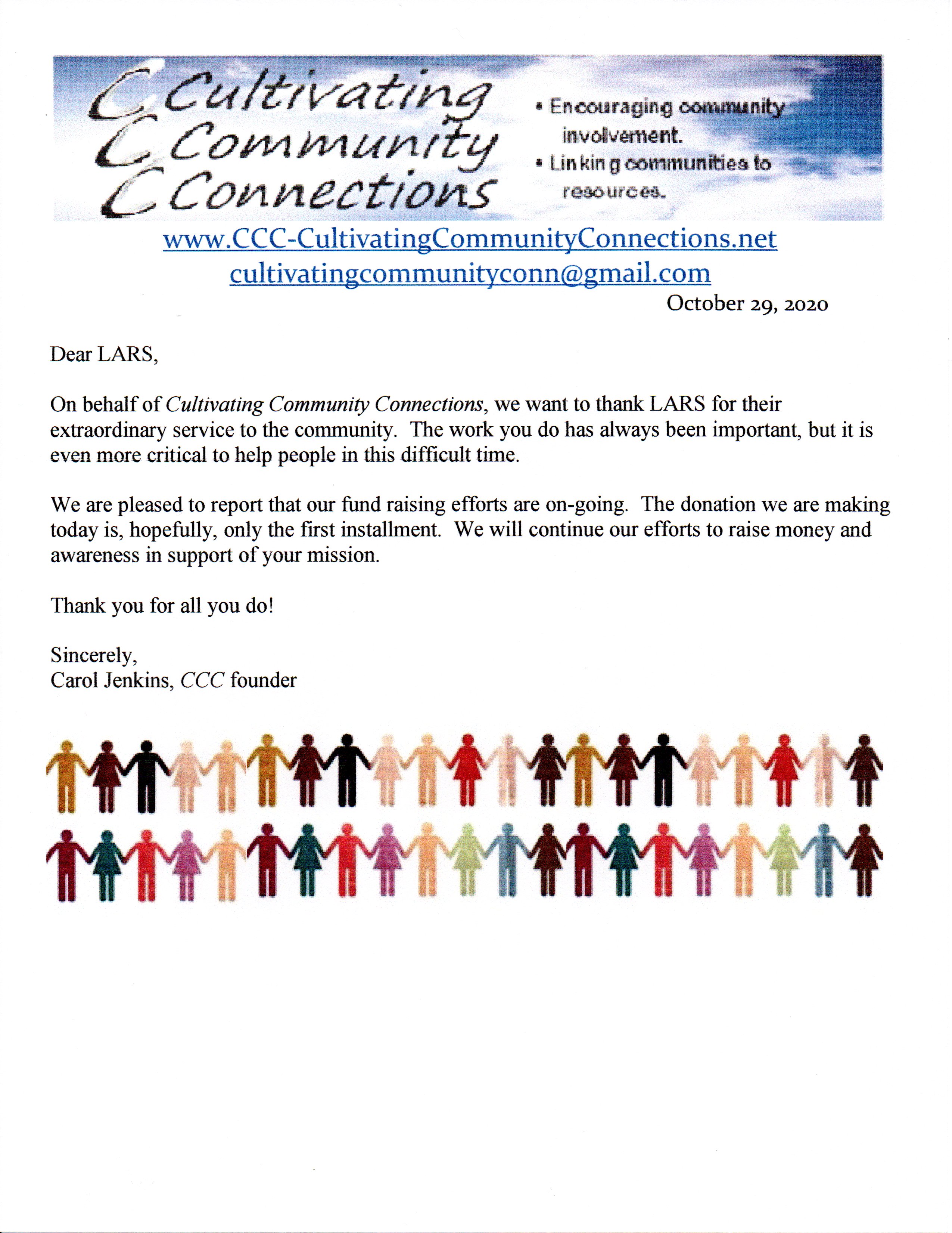 “Helping Neighbors In Need”Thank you to everyone that helped Cultivating Community Connections raise money for Laurel Advocacy and Referral Services (LARS) during the month of October. We are pleased and excited that over $400 was donated and given this morning to LARS. Our efforts are on-going. Every penny goes to restock the food pantry and provide critical financial support for neighbors in need. See all at CCC/LARS